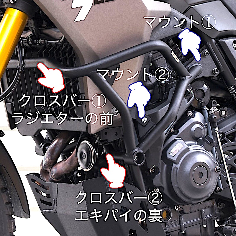 本製品は、車輌フレームに両側4箇所で固定し、更に前側の2本のクロスバーによってクラッシュバーの剛性を高めています。(※エンジンのボス部分へ固定するタイプではありません。)
