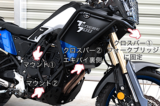 本製品は、クラッシュバーの両側4箇所で車輌フレームに固定します。更に、上側のクロスバーをフォークブリッジに固定し、下側のクロスバーをマフラー裏側に配置する強固な構造です。(※エンジンのボス部分へ固定するタイプではありません。)