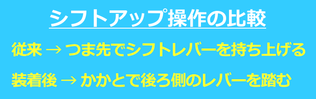 一度シフトレバーのかかと操作に慣れると、シフトアップ操作は気の迷いなく「かかと」で行うようになります。しばらくすると、シフトアップの時につま先でシフトレバーを持ち上げる習慣を忘れてしまうくらい快適です。